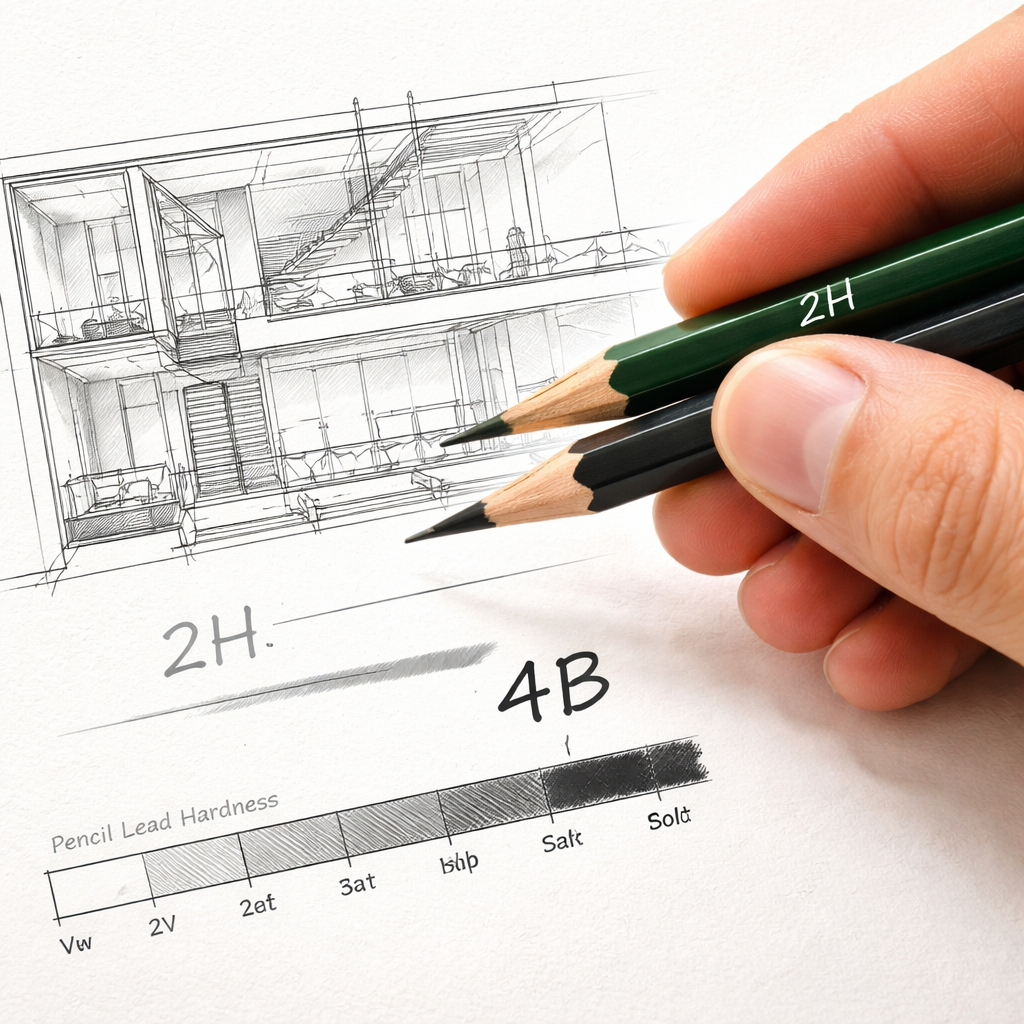 You don’t need a full range from 9H to 9B. A focused set of a 2H, a HB, a 2B, and a 4B covers most rendering tasks. The 2H gives you the fine, non‑smearing lines for plans. The HB works as an all‑rounder for medium details. The 2B and 4B let you add depth and shadow without grinding the paper.
